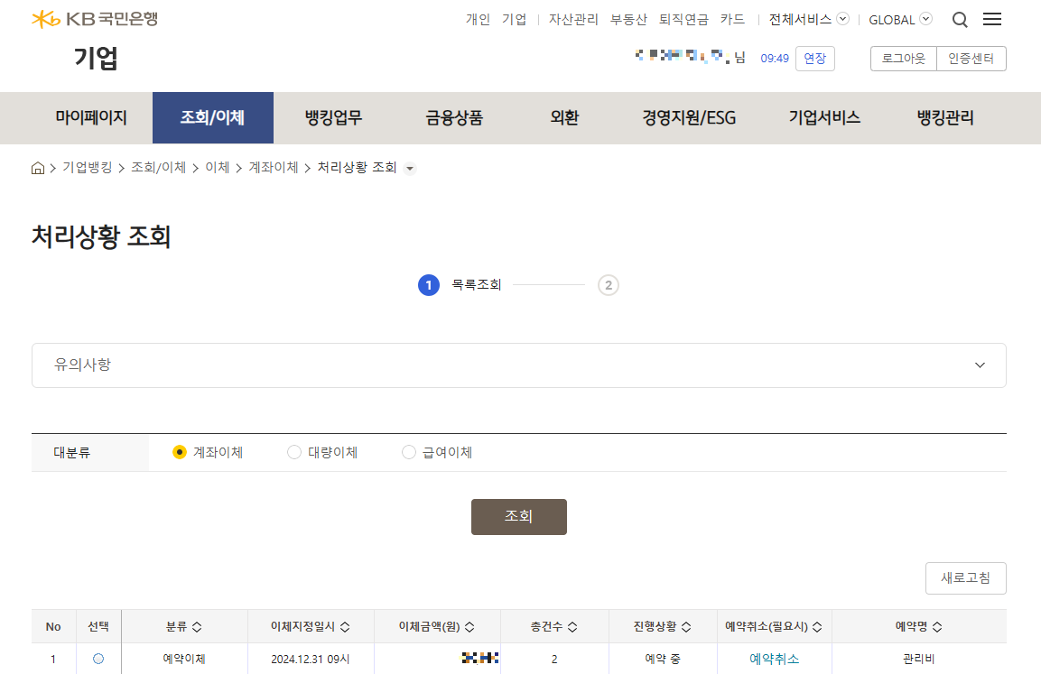 '계좌이체 → 처리상황 조회' 를 선택합니다.