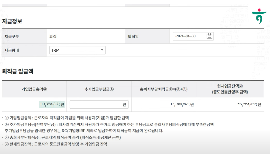 4. 퇴직금 계산내역이 더 많을경우 추가 입금부담액에 입력 후 신청 제출