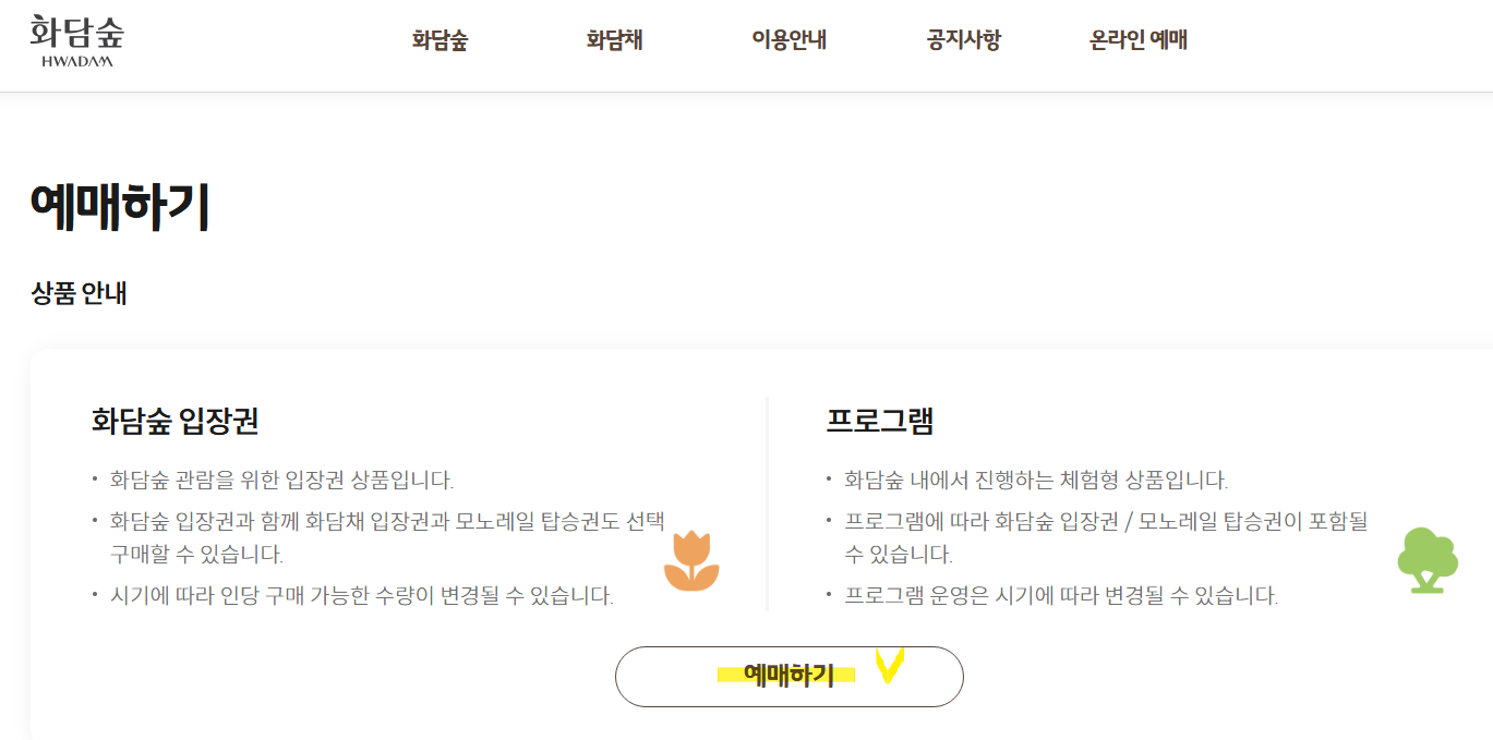 - 예매 가능 상품 : 입장권, 화담채 전시관 입장권, 모노레일 탑승권