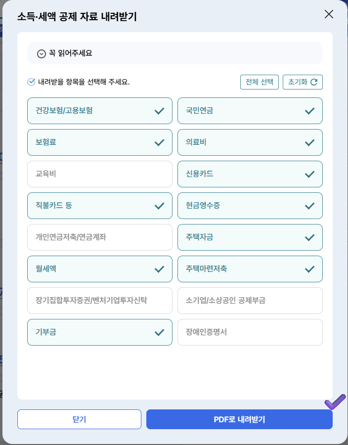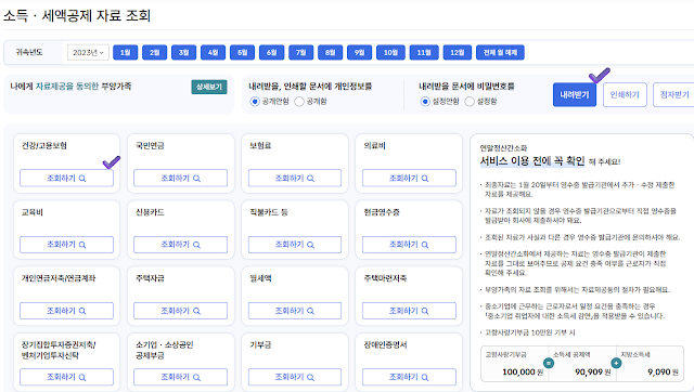 홈택스에서는 다양한 세액 공제 자료를 조회할 수 있습니다. 예를 들어, 의료비, 교육비, 기부금, 보험료 등 여러 항목에 대한 자료를 한 번에 조회할 수 있습니다. 각 항목별로 필요한 자료를 선택하고, 다운로드 버튼을 클릭하면 해당 자료를 쉽게 받을 수 있습니다.(근무월만 체크해야 합니다!)