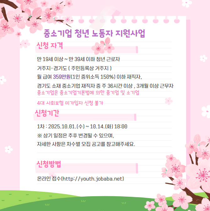 신청 자격은 다음과 같습니다. 만 19세에서 39세 이하의 청년 근로자여야 하며, 월 급여가 359만 원 이하인 경우에 해당합니다. 또한, 경기도 내 중소기업에서 주 36시간 이상 근무해야 합니다. 이 외에도 지역에 따라 추가적인 자격 요건이 있을 수 있으니, 자세한 사항은 관련 웹사이트를 통해 확인하시기 바랍니다.