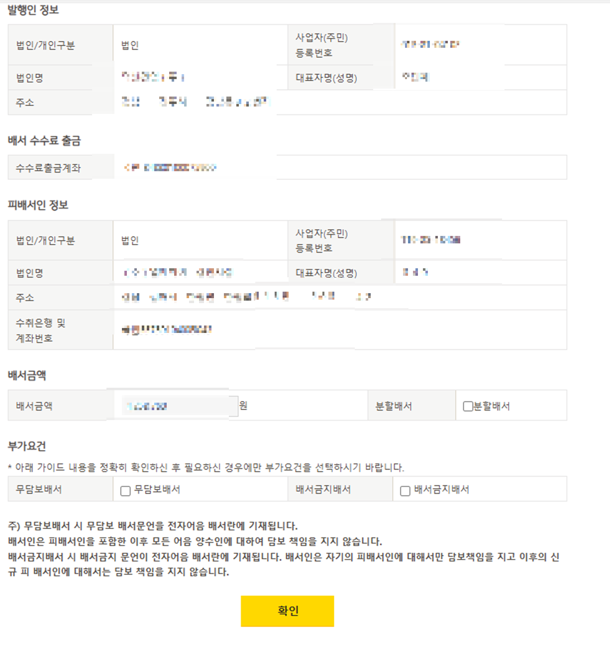 모든 정보를 확인한 후 '확인' 버튼을 클릭하면 배서금액이 뜨는데 분할배서를 클릭하면 됩니다.