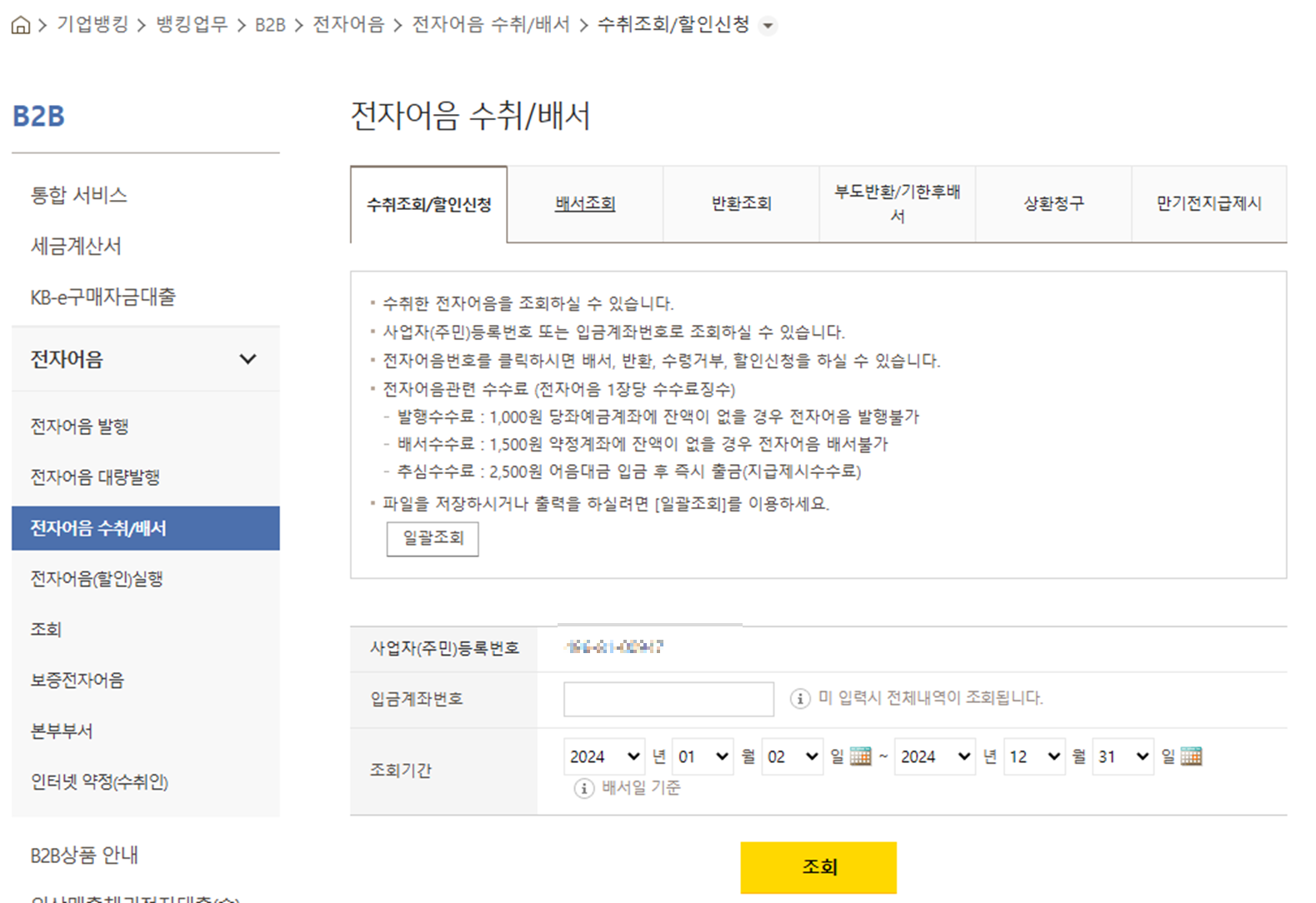조회를 누르면 받은 어음을 조회할 수 있습니다.